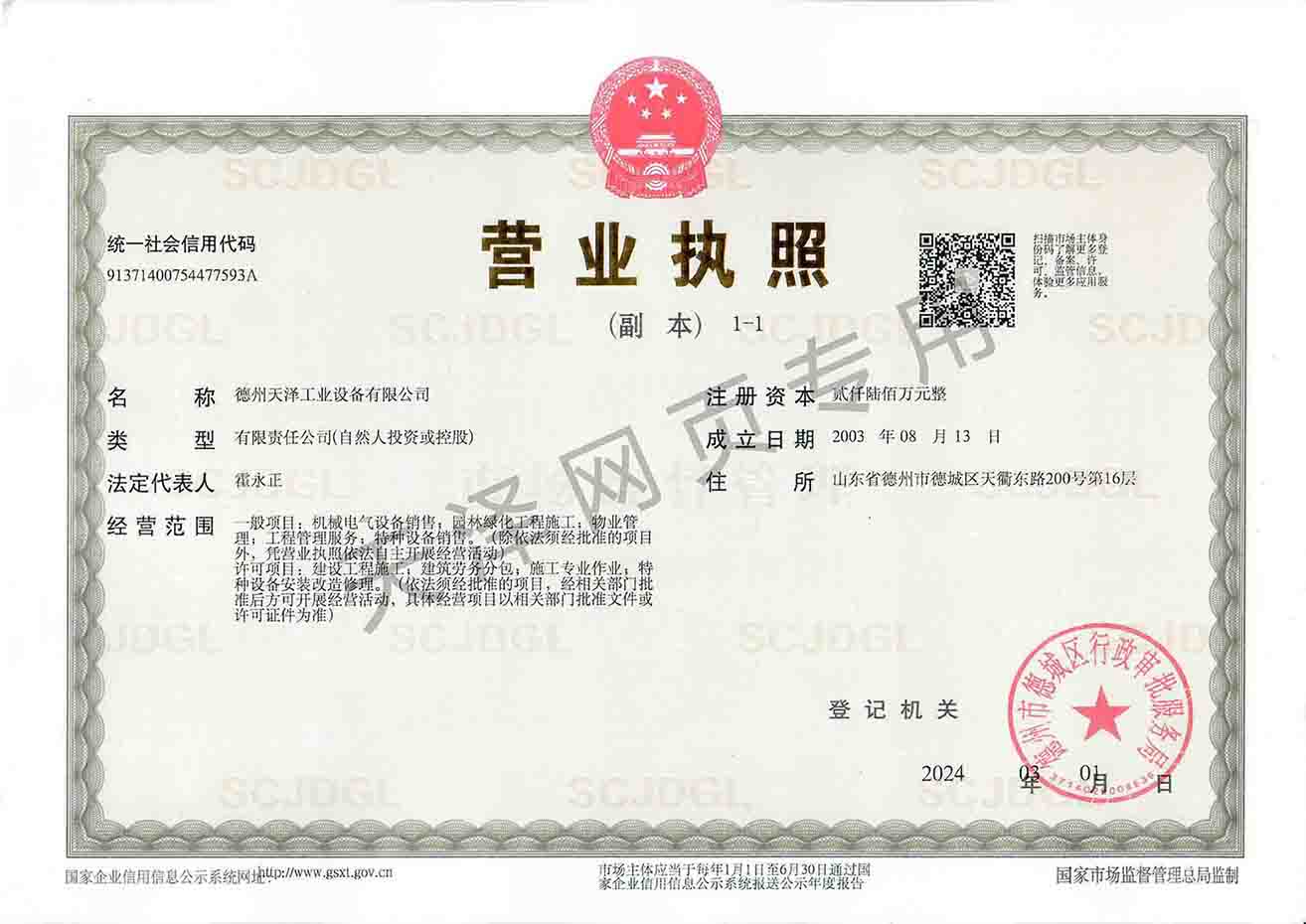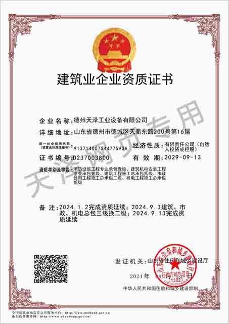 德州天澤工業設備有限公司成立于2003年(前身為德州天元集團天明工業設備安裝公司),經過20多年的發展,現成長為擁有職工600余人,各類專業技術人員近300余人,年生產能力兩億元以上,以建筑機電安裝工程、消防設施安裝工程施工為主,集建筑工程施工、市政工程施工、建筑智能化工程施工、園林綠化工程施工、工程管理服務、物業管理、電氣機械設備銷售等多元化經營于一體的綜合型企業。2005年,企業按照國際標準建立的質量管理體系,通過了ISO質量管理體系認證、環境管理體系認證、職業健康安全管理體系認證。施工工程遍布山東、河北、四川、江蘇等地,最具代表性的工程有:山東省德州市百腦匯資訊廣場機電安裝工程、德州經濟開發區天元大廈機電安裝工程、陵城區人民醫院機電安裝工程、德州金魯班大廈機電安裝工程、河北故城金辰小區機電安裝工程、北川地震災后援建工程等。多年來,公司始終堅持“以人為本,建精品工程,創行業品牌”的經營理念,先后榮獲。ㄊ校┘壧┥奖⑻旄、魯安杯等獎項,申報各種功法、多項專利。